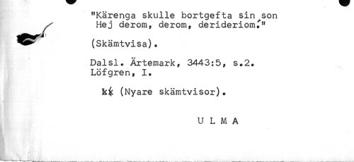 //// "Kärenga skulle bortgefta sin son //// / Hej derom, derom, derideriom^" //// (Skämtvisa). //// Dal si. Ärtemark, 3443:5, s.2. //// Löfgren, 1. //// (Nyare skämtvisor). //// ^^ ^_____U L M A ////