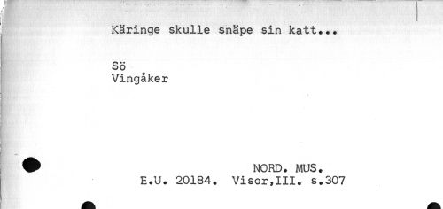//// ' //// Käringe skulle snäpe sin katt... //// SÖ //// Vingåker //// * //// HR. - - //// ^ NORD. MUS. //// E.U. 20184. Visor,III. s.307 ////