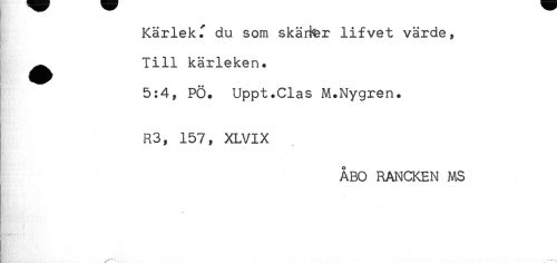 //// Kärlekf du som skär^r lifvet värde, //// ^^ Till kärleken. //// 5:4, PÖ. Uppt.Clas M.Nygren. //// R3, 157, XLVIX //// ÅBO RANCKEN MS ////