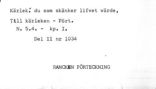 //// Kärlek^ du som skänker lifvet värde, //// Till kärleken - Port. //// N. 5.4. - kp. 1. //// Del II nr 1034 //// * //// RANCKBN FÖRTECKNING //// ' \ \ ////