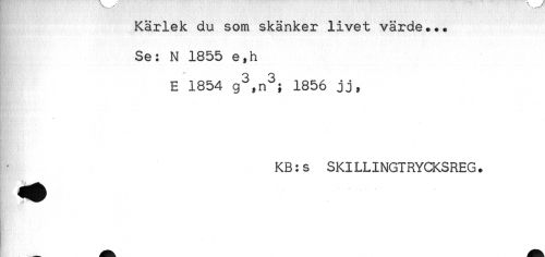 //// Kärlek du som skänker livet värde... //// Se: N 1855 e,h //// E 1854 g^n^; 1856 jj, //// KB:s SKILLINGTRYCKSREG. ////
