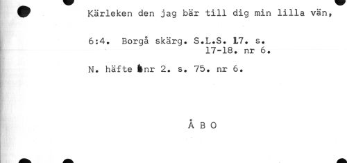 //// Kärleken den jag bär till dig min lilla vän, //// 6:4. Borgå skärg. S.L.S. 1L7* s. //// r 17-18. nr 6. //// N. häfte hnr 2. s. 75. nr 6. //// å //// o //// A B 0 ////