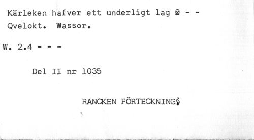 //// Kärleken hafver ett underligt lag 8 - - //// Qvelokt. Wassor. //// W. 2.4 --- //// Del II nr 1035 //// RANCKEN FÖRTECKNING§ ////