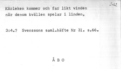 //// Kärleken kommer och far likt vinden //// när denom kvällen spelar i linden, //// 3:4.? Svenssons saml+häfte Nr 31. s.66. ////