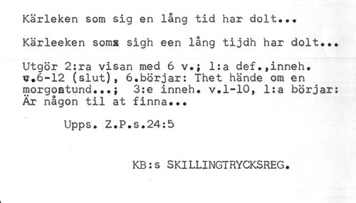 //// Kärleken som sig en lång tid har dolt... //// Kärleeken somx sigh een lång tijdh har dolt... //// Utgör 2:ra visan med 6 v.; l:a def.,inneh. //// u.6-12 (slut), 6.börjar: Thet hände om en //// morgoatund...; 3:e inneh. v.1-10, l:a börjar: //// Är någon til at finna... //// Upps. Z.P.s.24:5 //// KB:s SKILLINGTRYCKSREG. //// * //// k ////