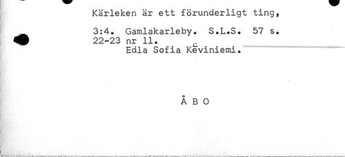//// Kärleken är ett förunderligt ting, //// K*:,' //// 3:4. Gamlakarleby. S.L.S. 57 s. //// ^ 22-23 nr 11. //// Edla Sofia Keviniemi. //// t //// H; //// ! //// ÅBO ////
