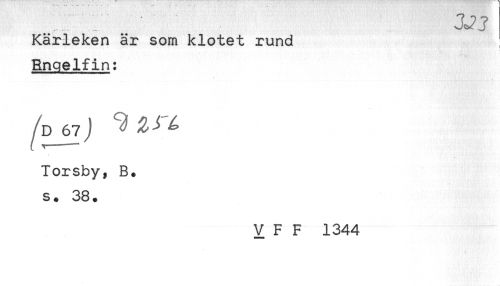 //// JJJ //// Kärleken är som klotet rund //// Rngelfin: //// /D67J ^^^ //// lorsby, B. //// s. 38. //// V F F 1344 ////