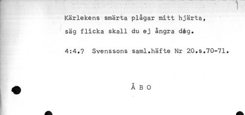 //// . . - .. .. . //// - ' //// - //// Kärlekens smärta plågar mitt hjärta, //// ,. t j //// säg flicka skall du ej ångra dåg. //// 4:4.? Svenssons saml.häfte Nr 20.s.70-71. //// ^ ÅBO ////