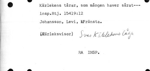 //// ^ Kärlekens tarar, som mangen haver sarat--- //// insp.Rtj. 15419:12 //// Johansson, Levi, kFränsta. //// kärleksvisor) J^ ^^^ //// * //// RA INSP. ////