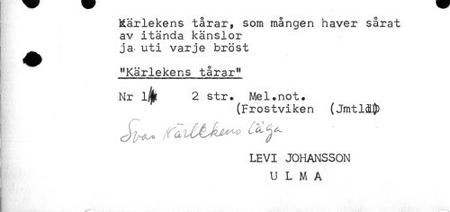//// Kärlekens tårar, som mången haver sårat //// ' av itända känslor //// i ^^^ ja- uti varje bröst //// } "Kärlekens tårar" //// i Nr lå 2 str. Mel.not. //// ' (Frostviken (Jmtl# //// T //// * LEVI JOHANSSON //// J //// } U L M A //// T ////