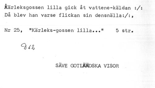//// Kärleksgossen lilla gick åt vattene-käldan :/: //// Då blev han varse flickan sin densnälla:/:, //// Nr 25, "Kärleks-gossen lilla..." 5 str. //// SÄVE GOTLÄNDSKA VISOR //// * * *. .< ////
