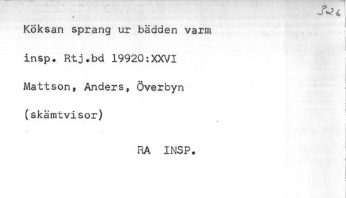 //// Köksan sprang ur bädden varm //// insp. Rtj.bd 19920:XXVI //// Mattson, Anders, Överbyn //// } //// (skämtvisor) //// RA INSP. //// i //// i ////