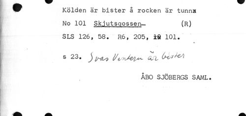 //// ! V Kölden är bister å rocken är tunna //// No 101 Skjutsgossen— (R) //// SLS 126, 58. R6, 205, 18 101. //// ! s 23. ^ //// ÅBO SJÖBERGS SAML. ////