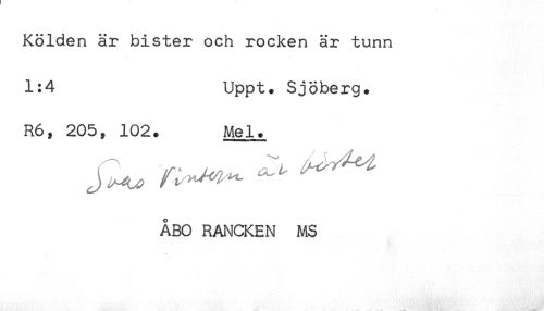//// Kölden är bister och rocken är tunn //// 1:4 Uppt. Sjöberg. //// R6s 205, 102. Mel. //// j ^ - ^ //// ÅBO RANCKEN MS ////