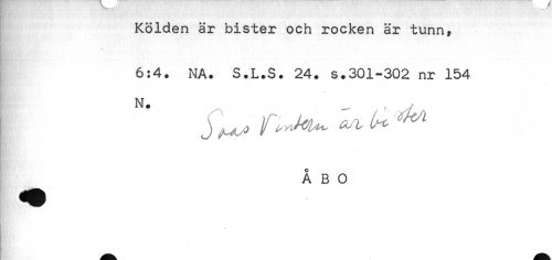 //// Kölden är bister och rocken är tunn, //// 6:4. NA. S.L.S. 24. s.301-302 nr 154 //// N. ^ , . //// /ÅBO //// s * ////
