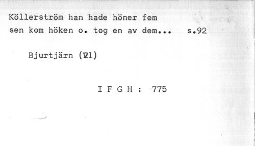 //// Köllerström han hade höner fem //// sen kom höken o. tog en av dem... s.92 //// i //// ' ! //// Bjurtjärn (51) //// I F G H : 775 ////