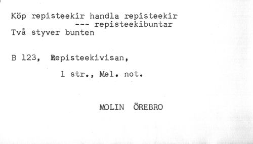 //// Köp repisteekir handla repisteekir //// -— repisteekibuntar //// Två styver bunten //// B 123, Repisteekivisan, //// 1 str., Mel. not. //// MOLIN ÖREBRO ////