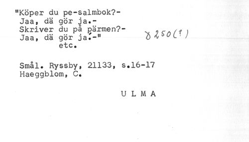 //// "Köper du pe-salmbok?- //// Jaa, dä gör ja.- //// Skriver du på pärmen?- ^ i ^/f ) //// Jaa, da gor ja.-" //// etc. //// Smal. Ryssby, 21133, s.16-17 //// Haeggblom, C. //// U L M A ////