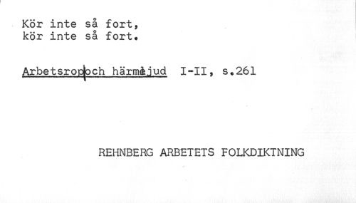 //// Kör inte så fort, //// kör inte så fort. //// Arbetsrop^och härm&jud 1-11, s.261 //// REHNBERG ARBETETS FOLKDIKTNING ////