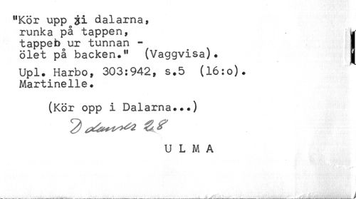 //// "Kör upp dalarna, //// runka på tappen, h? //// tappeb ur tunnan - ) //// ölet på backen." (Vaggvisa). B //// Upl. Harbo, 303:942, s.5 (16:o). //// Martinelie. //// (Kör opp i Dalarna...) //// U L M A ////