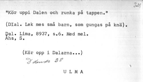 //// "Kör uppi Dalen och runka på tappen." //// (DIal. Lek mes små barn, som gungas på knä). //// Pal. Lima, 8937, s.6. Med mel. //// Ahs, S. //// (Kör opp i Dalarna...) ////