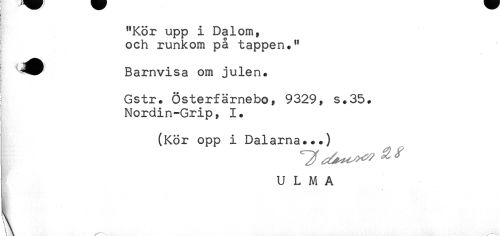 //// r //// "Kör upp i Dalom, //// och runkom på tappen." //// ! //// Barnvisa om julen. //// I Gstr. Österfärnebo, 9329, s.35. //// Nordin-Grip, 1. //// (Kör opp i Dalarna...) //// U L M A ////