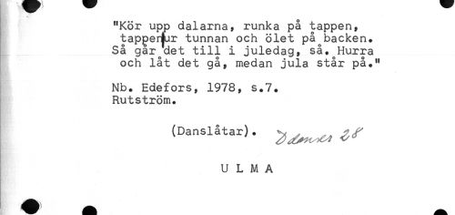 //// "Kör upp dalarna, runka på tappen, //// tappedur tunnan och ölet på^backen. //// Så gar det till i juledag, så. Hurra //// och låt det gå, medan jula står på." //// Ht //// Nb. Edefors, 1978, s.7. //// Rutström. //// (Danslåtar). //// _ ////
