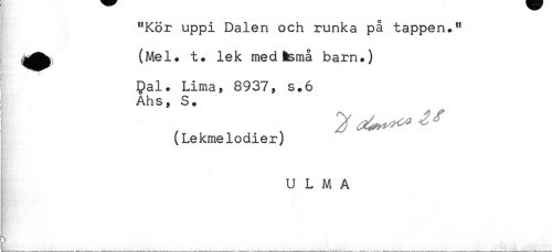 //// "Kör uppi Dalen och runka på tappen." //// (Mel. t. lek medEsmå barn.) //// pal. Lima, 8937, s.6 //// Ahs, S. //// (Lekmelodier) //// U L M A //// - ////