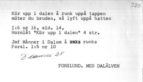 //// Kör upp i dalen å runk uppå tappen //// möter du bruden, så lyft uppå hatten //// 1:6 nr 16, sid. 14, //// Hornlåt "Kör upp i dalen" 4 str. //// Jmf Månner i Dalom å runka //// Forsl. 1:5 nr 10 //// ? ////
