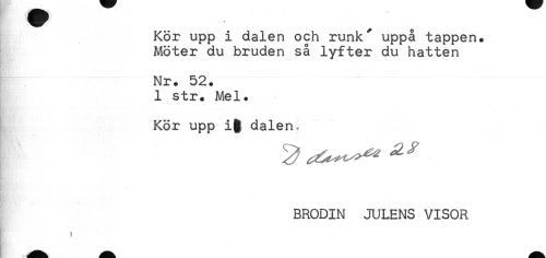 //// Kör upp i dalen och runk' uppå tappen. //// Möter du bruden så lyfter du hatten //// . Nr. 52. //// 1 str. Mel. //// Kör upp dalen. ////