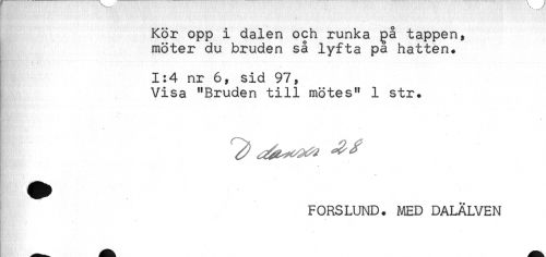 //// Kör opp i dalen och runka på tappen, //// möter du bruden så lyfta pa hatten. //// 1:4 nr 6, sid 97, //// Visa "Bruden till mötes" 1 str. //// FORSLUND. MED DALÄLVEN //// . ////