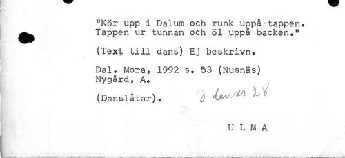 //// ? //// "Kör upp i Dalum och runk uppå-tappen. //// ^^ Tappen ur tunnan och öl uppa backen." //// - H H //// (Text till dans) Ej beskrivn. //// * //// * //// < //// Dal. Mora, 1992 s. 53 (Nusnäs) //// Nygård, A. //// (Danslåtar). 9 ^ ^ ////