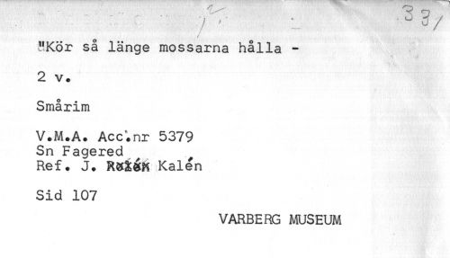 //// / ' -- " //// // <\ H //// !!Kör så länge mossarna hålla - //// 2 v. //// Smårim //// V.M.A. Acc'.nr 5379 //// Sn Fagered //// Ref. J. R^^K Kalén //// Sid 107 ////