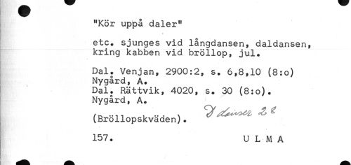 //// "Kör uppå daler" //// * //// etc. sjunges vid långdansen, daldansen, //// kring kabben vid bröllop, jul. //// Dal. Venjan, 2900:2, s. 6,8,10 (8:0) //// Nygård, A. //// Dal. Rättvik, 4020, s. 30 (8:0). //// Nygård, A. //// (Bröllopskväden). //// 157. U LM A ////