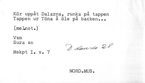 //// Kör uppåt Dalarna, runka på tappen //// Tappen ur Töna å öle på backen... //// (meLnot.) //// Vsm //// Sura sn //// Mskpt 1. s. 7 ////