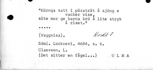 //// "Körnga satt i päraträt å sjöng e //// ^^ vacker vise, //// söte mor ge barna brö å lite stryk //// å riset." //// (Vaggvisa). //// Sdml. Locknevi, 4684, s. 6. //// Claesson, L. //// (Det sitter en fågel...) , U L M A //// * *.. - - * .. //// * * ////