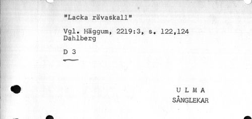 //// < //// "Lacka rävaskall" //// Vgl. Häggum, 2219:3, s. 122,124 //// Dahlberg //// D 3 //// ^ U L M A //// SÅNGLEKAR ////