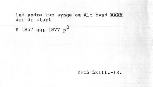 //// t //// t //// Lad andre kun synge om Alt hvad M&XX //// der är stort //// ! //// E 1857 gg; 1877 p^ //// I //// KB:S SKILL.-TR. ////