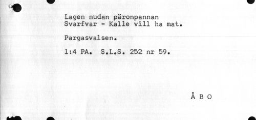 //// § //// Lagen nudan päronpannan //// Svarfvar - Kalle vill ha mat. //// Pargasvalsen. //// 1:4 PA. S.L.S. 252 nr 59. //// ! \. //// ' ' ' . * ////