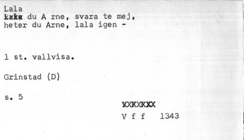 //// Laia //// Rata du A me, svara te mej, //// heter du Arne, lala igen - //// 1 st. vallvisa. //// < //// t //// Grinstad (D) //// ' '' ; ..*-' '' ,'"' '',:''!*"' t //// s. 5 //// MXKXKXX //// V f f 1343 //// i //// t //// E //// t ////