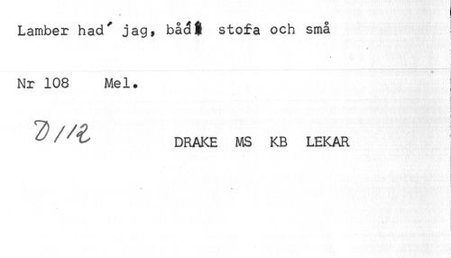 //// ; //// Lamber had' jag, stofa och små //// * ^ //// t //// Nr 108 Mel. //// ) //// DRAKE MS KB LEKAR //// < //// ^ t ////