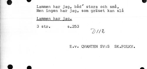 //// Lammen har jag, båd' stora och små. //// Men ingen har jag, som gräset kan slå //// Lammen har jag. //// 3 str. s.253 //// ! //// E.v. QVANTEN SV:S SK.FOLKV. //// _ ////
