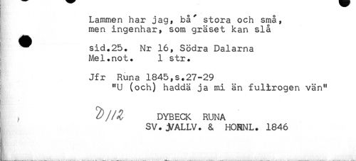 //// Lammen har jag, bå" stora och små, //// men ingenhar, som gräset kan slå //// ^ sid.25. Nr 16, Södra Dalarna //// Mel.not. 1 str. //// Jfr Runa 1845,s.27-29 //// "U (och) haddä ja mi än fultrogen vän" //// , DYBECK RUNA //// , SV. ^/ALLV. & HORNL. 1846 ////