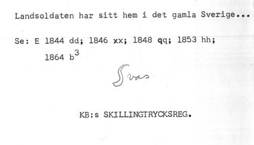 //// Landsoldaten har sitt hem i det gamla Sverige... //// Se: E 1844 dd; 1846 xx; 1848 qq; 1853 hh; //// 1864 b^ //// KB:s SKILLINGTRYCKSREG. ////