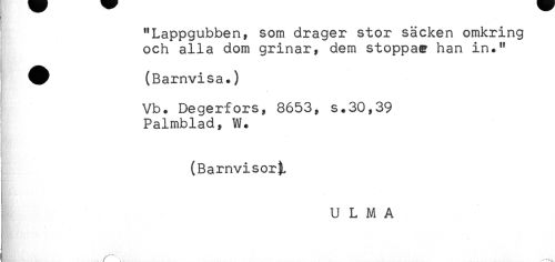 //// "Lappgubben, som drager stor säcken omkring //// och alla dom grinar, dem stoppae han in." //// ^ (Barnvisa.) //// Vb. Degerfors, 8653, s+30,39 //// Palmblad, W. //// t //// (BarnvisorjL //// U L M A //// B ////
