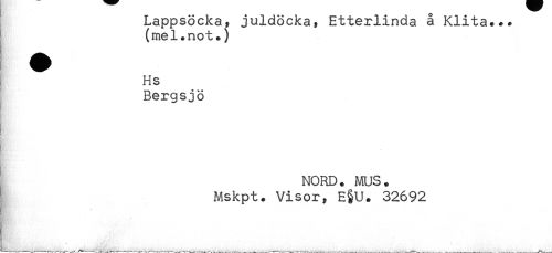 //// Lappsöcka, juldöcka, Etterlinda a Klita... //// * (mel.not.) //// Hs //// Bergsjö //// ! //// NORD. MUS. //// Mskpt. Visor, E§U. 32692 ////