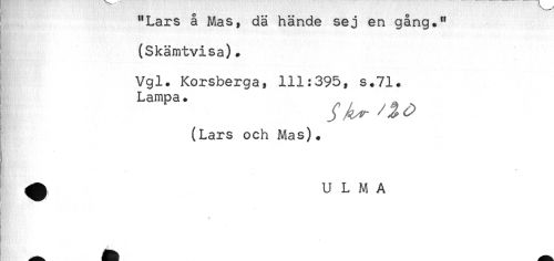 //// "Lars a Mas, dä hände sej en gång." //// (Skämtvisa). //// ; Vgl. Korsberga, 111:395, s.71. //// t Lampa. //// (Lars och Mas). //// - //// ^ U L M A //// t: ////