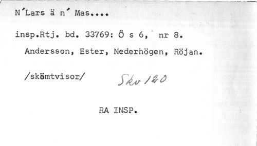 //// N^Lars ä n^ Mas.... //// insp.Rtj. bd. 33769: Ö s 6, nr 8. //// Andersson, Ester, Nederhögen, Röj an. //// /skämtvisor/ ^ ^ ^ //// RA INSP. ////