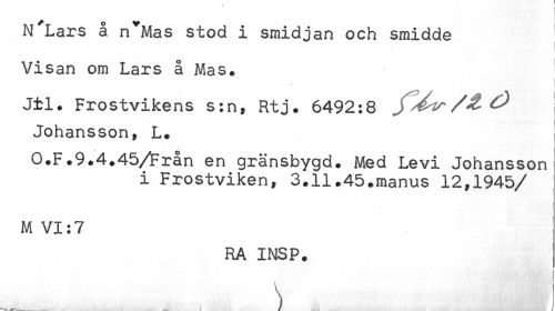 //// N^Lars å n*Mas stod i smidjan och smidde //// Visan om Lars å Mas. //// Jtl. Frostvikens s:n, Rtj. 6492:8 //// Johansson, L. //// O.F.9.4.45/Från en gränsbygd. Med Levi Johansson //// i Frostviken, 3.11.45.manus 12,1945 //// /M VI:7 //// RA INSP. //// v //// ) ////