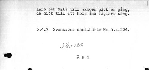 //// Lars och Mats till skogen gick en gång, //// de gick till att höra små fåglars sång. //// 5:4.? Svenssons saml.häfte Nr 5.S.234. //// v ^ ////